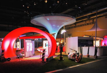 2014 war bei Alexander Bürkle das Jahr der Elektromobilität. Im Mittelpunkt unseres Konzeptes standen daher Elektrofahrzeuge und Solar-Carports. Die auffällig illuminierten 3D-Stoffkonstruktionen zogen die Besucher schon von Weitem an, und die unterschiedlichen Themenwelten – unterteilt durch wechselnde Bodenbeläge und Möblierung – luden zum Verweilen ein.