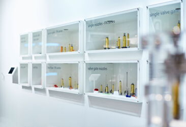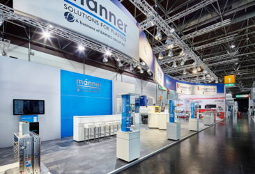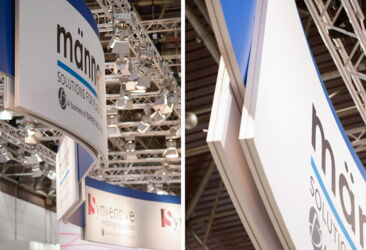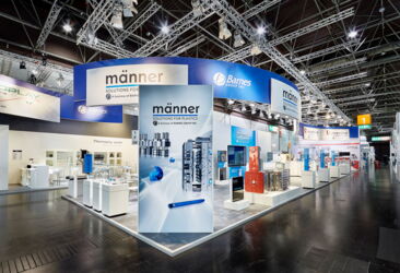 Für die Otto Männer GmbH haben wir bereits eine ganze Reihe von Messeauftritten gestaltet, für die K in Düsseldorf und die fakuma in Friedrichshafen genauso wie für die NPE in den USA. Dieses Jahr war die Aufgabenstellung besonders anspruchsvoll: Nicht nur für Otto Männer, sondern auch für zwei weitere Kunststoffspezialisten des Mutterkonzerns Barnes Group Inc. sollte ein Gemeinschaftsstand entwickelt werden, der die Unterschiede und Gemeinsamkeiten der drei Firmen gleichermaßen deutlich macht. Unsere Lösung ist so klar wie einfach: Ein Band im Dunkelblau von Barnes bildet die Klammer um den gesamten Stand. Erst darunter kommt das Corporate Design der drei Tochterfirmen Thermoplay, Synventive und Männer zum Tragen. Die individuell gefertigten Produktcounter und -vitrinen spiegeln den Qualitätsanspruch der drei Kunststoffexperten genauso wieder wie unsere Fertigungskünste als Messebauer.