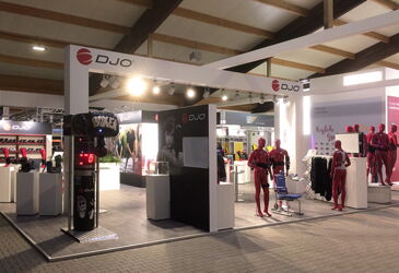 Wenn ein Kunde mit dem Leitspruch „Powering Motion“ auftritt, ist es klar, dass wir auf der Messe für Bewegung sorgen – im Falle des Orthopädie-Spezialisten DJO Global mit Schaufensterpuppen in Unternehmensfarben. Diese boten die optimale Präsentationsfläche für die Orthesen und Bandagen unseres Kunden. Außerdem lud ein Trainingsbereich mit Boxbirne die Besucher ein, selbst die Muskulatur zu stärken. Die großformatigen Bilder von aktiven Menschen im Freien und die natürlich wirkende Beleuchtung rundeten den dynamischen Auftritt ab.