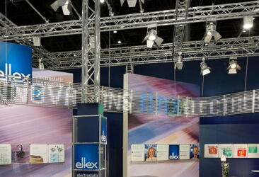 Eltex ist Experte für den Umgang mit Elektrostatik – für die Vermeidung unerwünschter Aufladungen genauso wie für ihren produktiven Einsatz in zahlreichen Fertigungsprozessen. Für uns war das der Anlass, bei der Konzeption des Standes auf elektrisch leitfähige Materialen zu setzen – bei den Traversenelementen genauso wie bei den Beleuchtungselementen und beim Mobiliar. Das geschwungene LED-Laufband und die großflächigen Grafiken setzen den Stand zusätzlich in Szene.