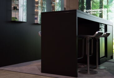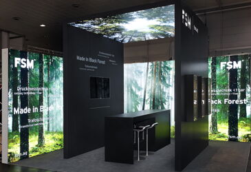 „Made in Black Forest“ – mit diesem Qualitätsanspruch fertigt die Kirchzartener Firma FSM AG Drucksensoriken, Akkutechnik und Trafoschaltrelais. Für das neue Messekonzept haben wir diesen Leitspruch wörtlich genommen und mit atemberaubenden Wand- und Deckengrafiken illustriert. Dank der dezenten Hinterleuchtung wirken die Waldmotive sehr natürlich und fügen sich harmonisch in die klaren Linien des Standes ein.
