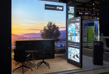 Intelligente Elektronik aus dem Schwarzwald – dafür steht die FSM AG aus Kirchzarten. Und wir als Messebauer setzen dieses Versprechen mit unserem Standkonzept wieder eins zu eins um: Die Unternehmensfarbe Schwarz verwenden wir als Hintergrund für Impressionen aus dem Elektronikunternehmen. Das Highlight ist aber der Sonnenaufgang über dem Schwarzwald, der den Stand dank Hinterleuchtung in ein warmes, freundliches Licht taucht.