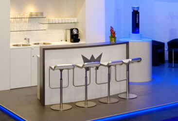 Hellma ist Weltmarktführer für optische Komponenten und optische Analysetechnik. In Anlehnung an Lichtstrahlen und zahlreiche runde Produkte von Hellma haben wir unser Standkonzept um eine Konstruktion aus hängenden Stoffröhren herum entwickelt. Das wechselnde Farbspiel in Gelb und Blau unterstreicht zusätzlich das Thema Optik.