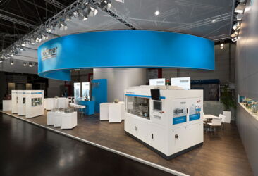 Otto Männer produziert hochpräzise Kunststoffteile für die Pharmaindustrie, Medizintechnik und für Produktverpackungen. Von der Form dieser Teile haben wir die Gestaltung des Standes abgeleitet: Rundungen prägen unser Messekonzept vom Wandablauf aus beschichteten Formteilen über die blau lackierten Theken bis hin zum beeindruckenden Deckenobjekt aus Stretch-Stoff. Der hochwertige Gesamteindruck und die Maße von 22 m in der Länge 3 m in der Höhe unterstreichen zusätzlich die Position des Unternehmens in seinem Segment.
