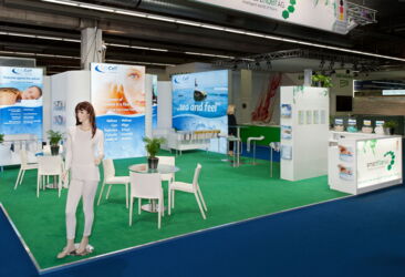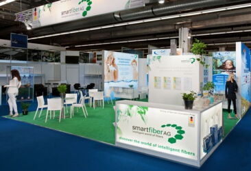 Hightech-Fasern aus natürlichen Rohstoffen und Zusätzen – dafür steht smartfiber. Den Bezug zu Naturmaterialien stellen wir durch den hochwertigen grünen Bodenbelag und die lebende Begrünung her. Die Leuchtkästen unterstreichen zusätzlich den hellen und offenen Gesamteindruck unseres Standkonzeptes.