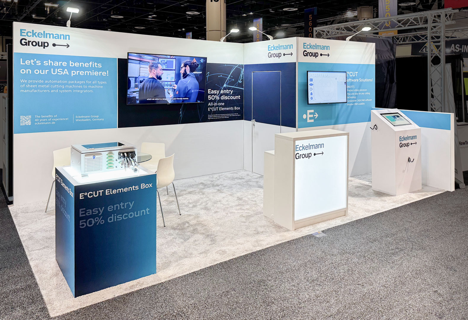Unser Standkonzept richten wir gezielt auf diese Aktion aus. In die Präsentationssäule an der Kreuzung der Gänge bauen wir starke Lichtelemente und eine durchscheinende Deckplatte ein. So tauchen wir die E°CUT Elements Box in eine Wolke aus Licht und lenken die Aufmerksamkeit gezielt auf die Hardware. Für die Software haben wir eigens ein Pult mit Touchscreen gestaltet, an dem sich die Besucher selbst einen Eindruck von den Funktionen und der Bedienung verschaffen können. Und unser Kunde? Der durfte sich über einen erfolgreichen Einstand in den Staaten freuen.