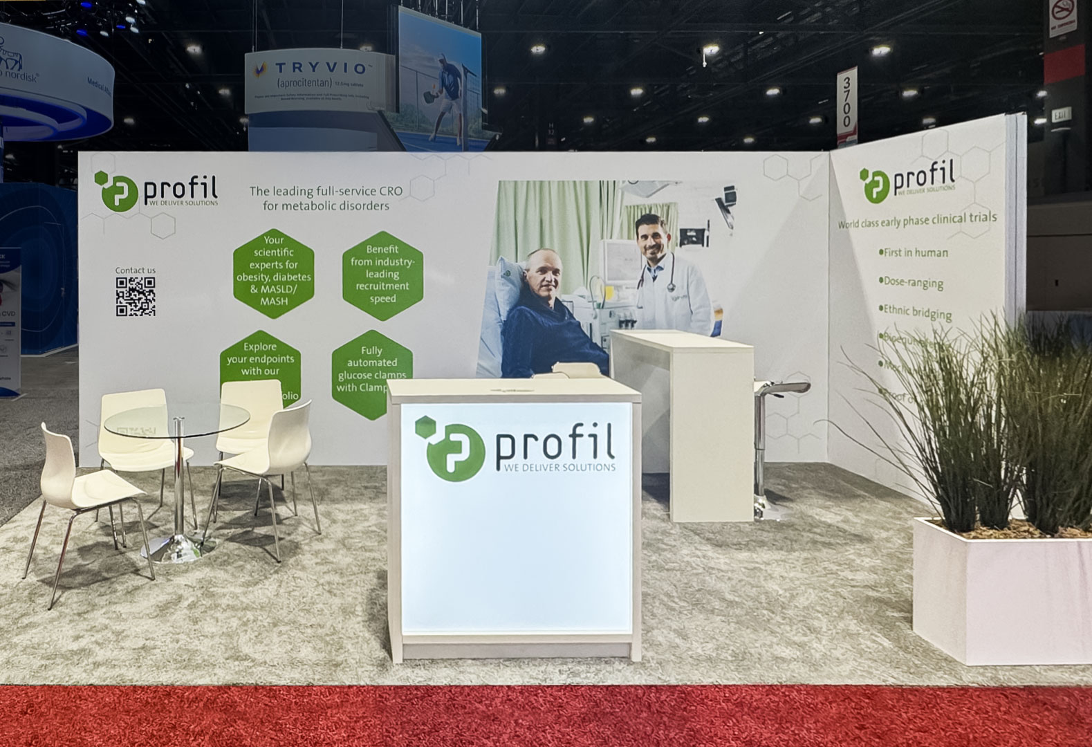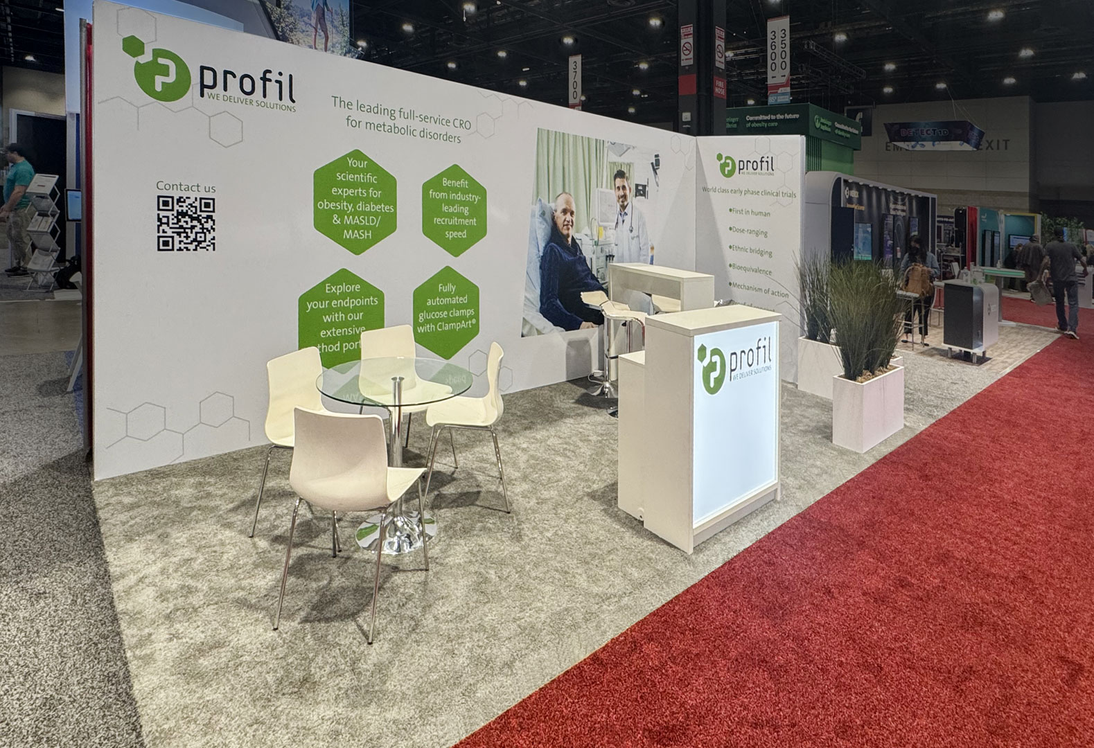 Für den Messestand in den Vereinigten Staaten haben wir eine sehr effiziente Gestaltung gewählt: Der Kommunikationsstand wirkt mit den hellen Rückwänden auffällig und freundlich. Die Markenzeichen an den Außenecken und an der hinterleuchteten Theke sorgen für eine einfache Wiedererkennung und setzen gleichzeitig die Farbwelt für den gesamten Stand. An der Theke werden die Besucher begrüßt und zu zwei Gesprächsbereichen geführt. Mit dieser klaren Besucherlenkung tragen wir dazu bei, dass der Auftragsforscher aus Neuss im wichtigen US-amerikanischen Markt sein Profil schärfen kann.