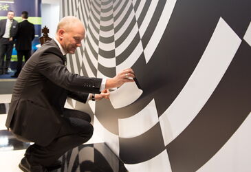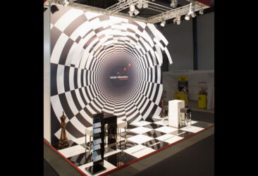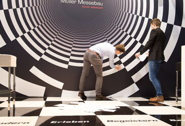 Selbstverständlich nutzen wir diese Gelegenheit, um alles zu zeigen, was unsere Kunden von uns erwarten können: einen weithin sichtbaren Stand, ein außergewöhnliches Design, eine perfekte technische Umsetzung – und natürlich das gewisse Extra, das die Aufmerksamkeit auf sich zieht. Wir haben die Besucher in die Rolle des Messebauers schlüpfen lassen und sie aufgefordert, das schwarz-weiße Tunnelelement an der Rückwand fertigzustellen. Die knifflige Aufgabe zog viele Messegäste an und sorgte an unserem kleinen Stand für großen Andrang.
