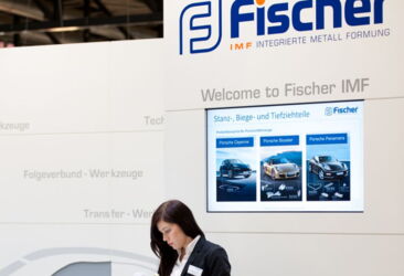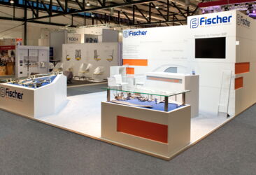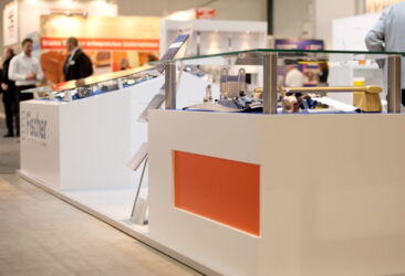 Fischer IMF from the Kaiserstuhl is specialized in tooling and stamping technology. While planning the stand we looked at the tool-forms and implemented the design into the furnishings. Details such as the three-dimensional graphics, integrated in the wall, also highlights the production know-how of Fischer IMF. Even visitors standing far away will be drawn to the stand because of the ceiling cube.