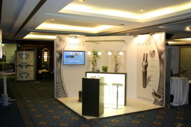 Simpact has the focus on a single product: a biologically compatible implant system for tooth replacement. By putting the product counter to the outer corner of the stand, the attention was drawn to the precisely constructed implants and tools. With the green area we moved the issue of biocompatibility in the focus.